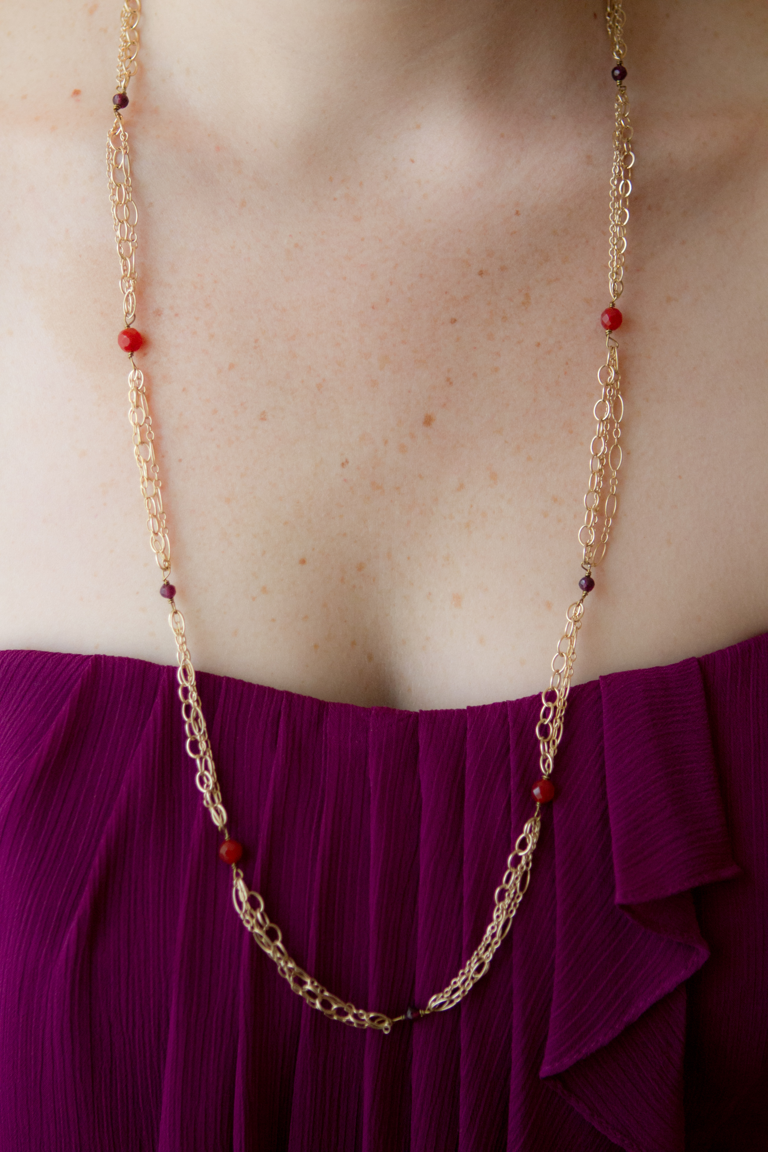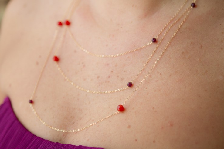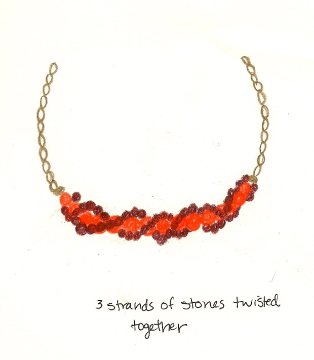 I took Alex’s answers, and with the image she sent of the bridesmaid’s dress and her inspiration for flowers, I sketched up 5 necklaces. She’d chosen gold as the metal for each piece, and with her color scheme and budget I chose garnet and carnelian stones.